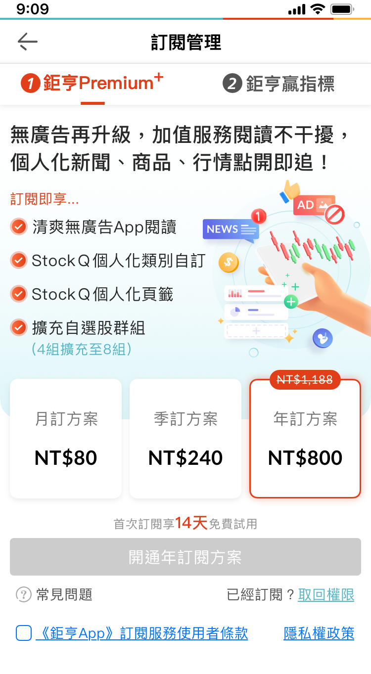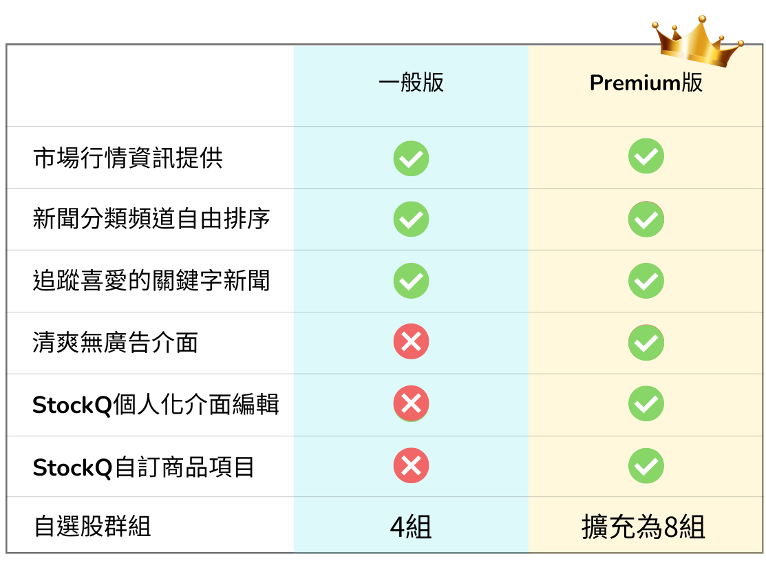 鉅亨APP全面開放「擴充自選股組數」,訂閱「鉅亨Premium+」可享無廣告閱讀環境,以及自選股組數從4組擴充為8組,每組可追蹤100筆自選股,歡迎APP用戶多加利用。