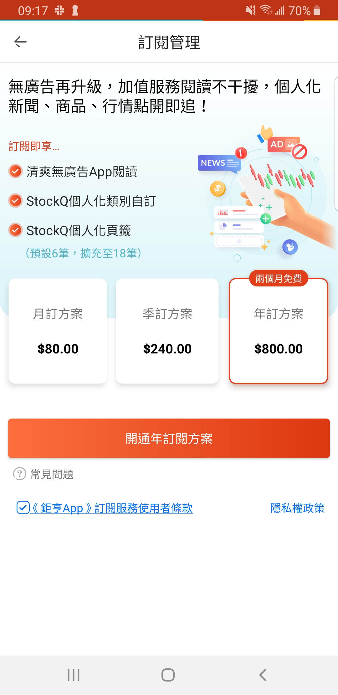 閱讀使用者條款後,選擇喜歡的方案進行訂閱開通