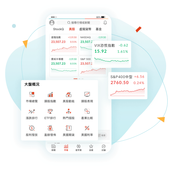 在市場專區,你可快速瀏覽台灣與主要國家股市指數行情、各國貨幣匯率及虛擬貨幣價格