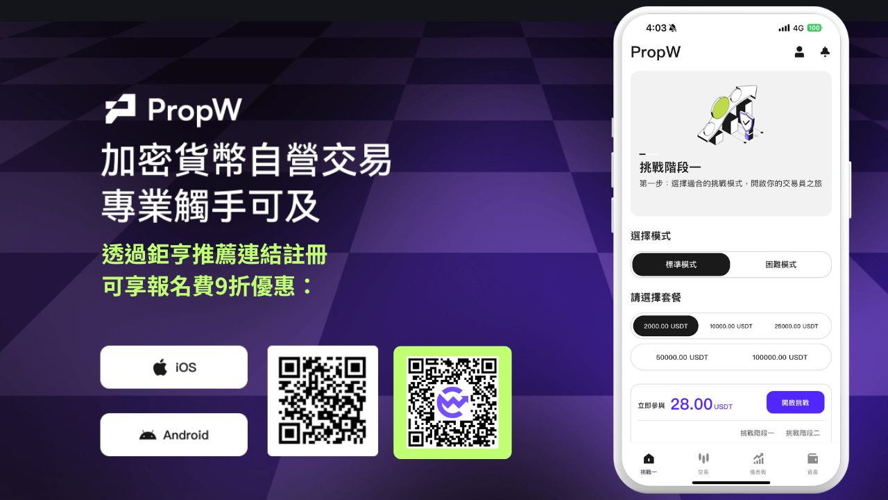 使用鉅亨推薦連結註冊CoinW,登入PropW交易員募集計畫,享有報名費9折優惠,挑戰零成本自營交易,成為CoinW交易員,贏取上千倍資金,從交易盈利中獲得 高達 80% 真 U 的分潤!